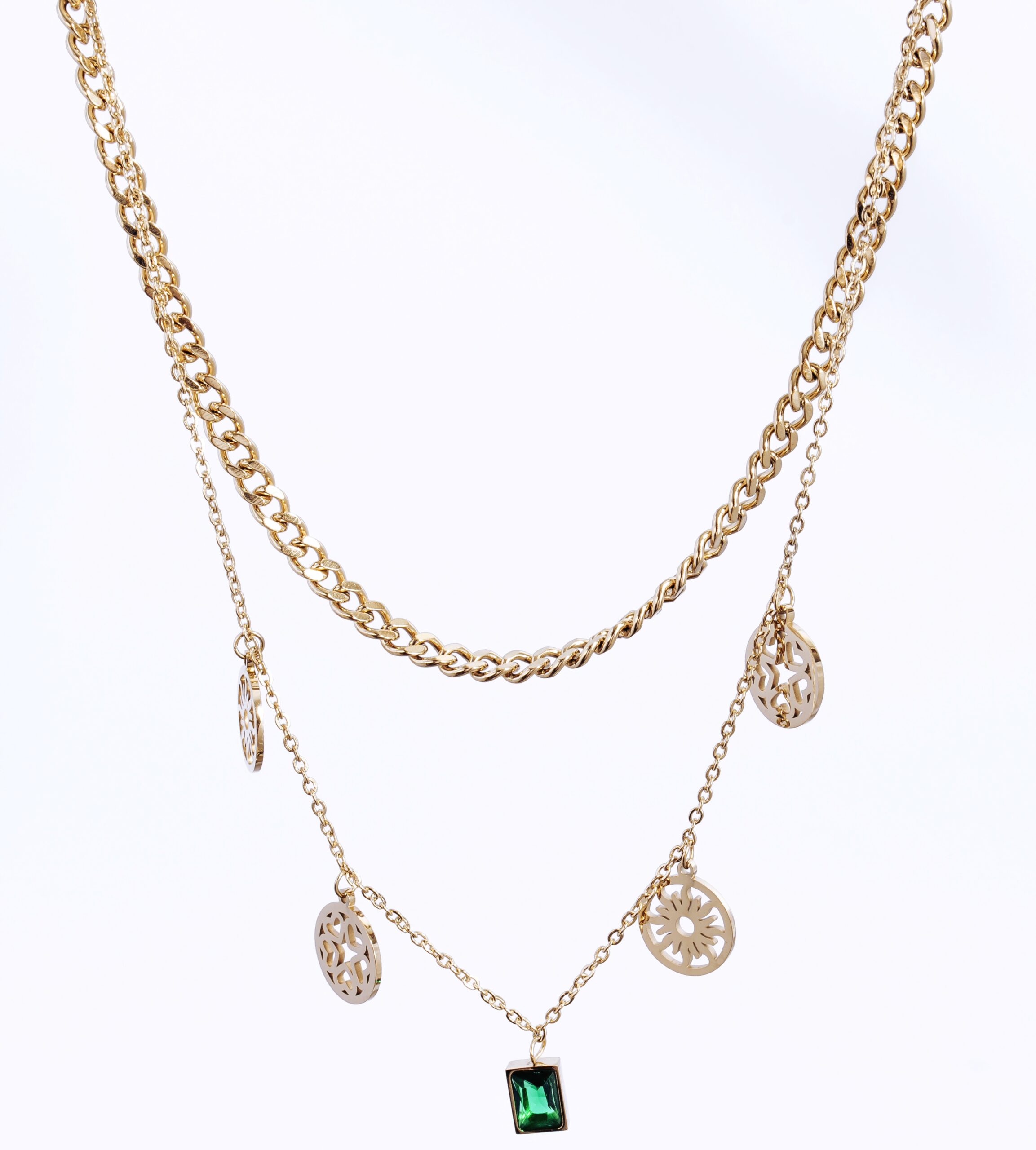 Double layer gold plated necklace with emerald quantity